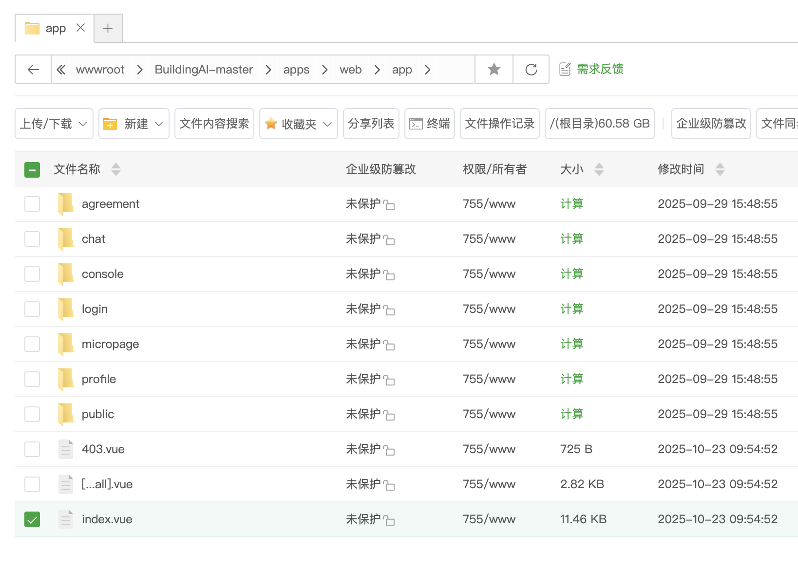## 1、根目录 项目根目录下的/public/web ## 2、底部版权修改 /www/wwwroot/BuildingAI-master/apps/web/app  /www/wwwroot/BuildingAI-master/apps/web/app/public/agent/_components  ## 3、启动加载图 /www/wwwroot/BuildingAI-master/public/web