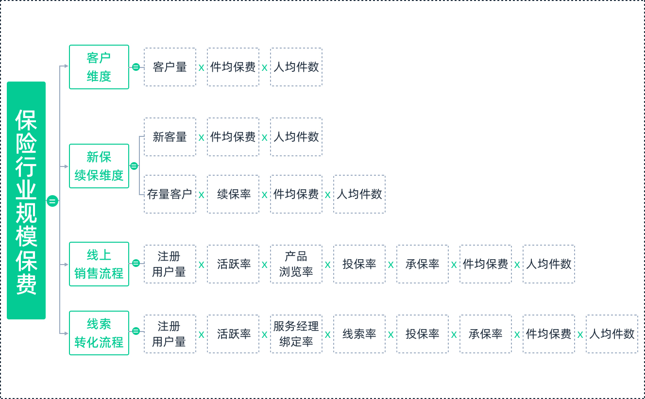 ## 规模保费 定义: 规模保费是指保险公司在对自己的业务收入,不分保险产品的种类和保险单的各类,所有保险产品的实际销售收入之和进行统计的形成保费总量。 拆解逻辑:  ## 保单客户数 定义: 已购买保险客户数量。 解读: 可以从平台类型、时间维度、险种、保险产品、省市地域、年龄、是否社保用户、是否续保等维度进行分 ## 保单数 定义: 提交订单的次数。 解读: 可以从平台类型、时间维度、险种、保险产品、省市地域、年龄、是否社保用户、是否续保等维度进行分析。 ## 保单用户特征分析 定义: 对保单用户的险种、年龄、性别等维度进行统计分析。 解读: 可以从保单类型、渠道、险种等维度分析。 ## 保单总金额 定义: 已购买保险的金额总和。 解读: 可以从平台类型、时间维度、险种、保险产品、省市地域、年龄、是否社保用户、是否续保等维度进行分析。 ## 累计用户数 定义: 累计用户数统计。 解读: 可以从平台类型、时间、渠道、新老用户、操作系统、保险险种、保险名称、缴费方案、缴费期限、缴费细节、投保选项等维度进行分析。 ## 理赔申请耗时 定义: 从点击理赔到完成理赔申请的时长。 解读: 可以从分支机构、代理人、险种、保险产品、平台类型、省市、时间周期等维度进行分析。 ## 提交理赔资料被驳回的人数、次数 定义: 提交理赔资料被驳回的人数或次数。 解读: 可以从分支机构、代理人、险种、保险产品、平台类型、省市、时间周期等维度进行分析。 ## 退保率 定义: 当年退保保单保险金额与年初有效保额总额的比值。 计算公式: 退保率 = 当年退保保单保险金额 ÷ 年初有效保额总额 解读: 该指标需控制在 20% 以下。可以从分支机构、代理人、险种、保险产品、平台类型、省市、时间周期等维度进行分析。 ## 退保申请点击人数、次数 定义 点击退保申请人数或次数。 解读: 可以从分支机构、代理人、险种、保险产品、平台类型、省市、时间周期等维度进行分析。 ## 完成理赔申请人数、次数 定义: 完成理赔申请人数或次数。 解读: 可以从分支机构、代理人、险种、保险产品、平台类型、省市、时间周期等维度进行分析。 ## 新增用户数 定义: 渠道拉新过来的新用户数。 解读: 可以从渠道、计划、组、落地页、 活动页版本、产品、代理等多维度进行分析。 此外,新增用户不局限于 APP 启动。中小型保险公司可能没有独立 APP ,通常采用活动页或者公众号的形式。 ## 续保支付转化率 定义: 非自动续报用户,从点击续保按钮到支付成功的转化率。 解读: 维持较高的续保率对保险公司的稳定经营非常重要。 ## 注册页面 PV 和 UV 定义: 注册页面的浏览次数。 解读: 可以从平台类型和渠道等维度进行分析。