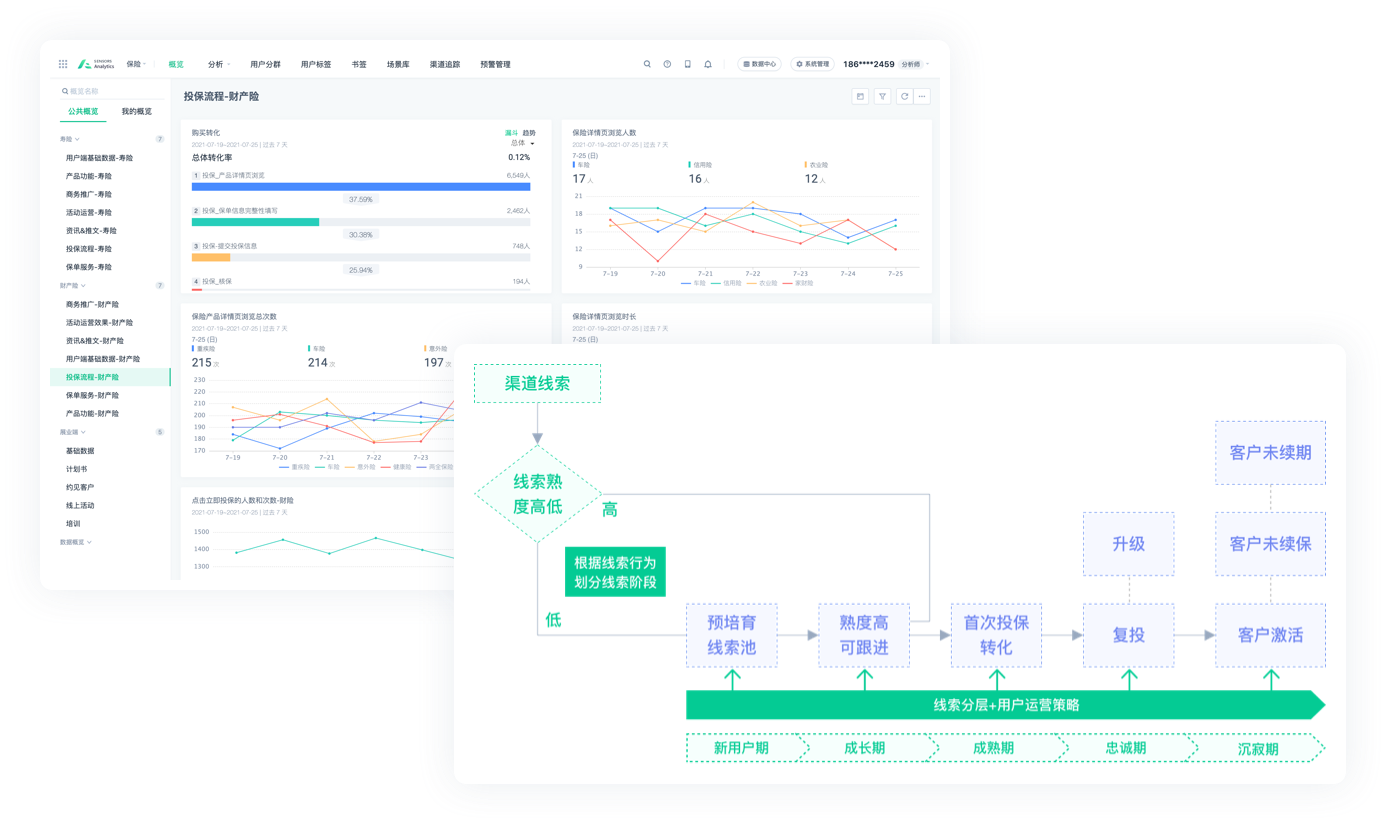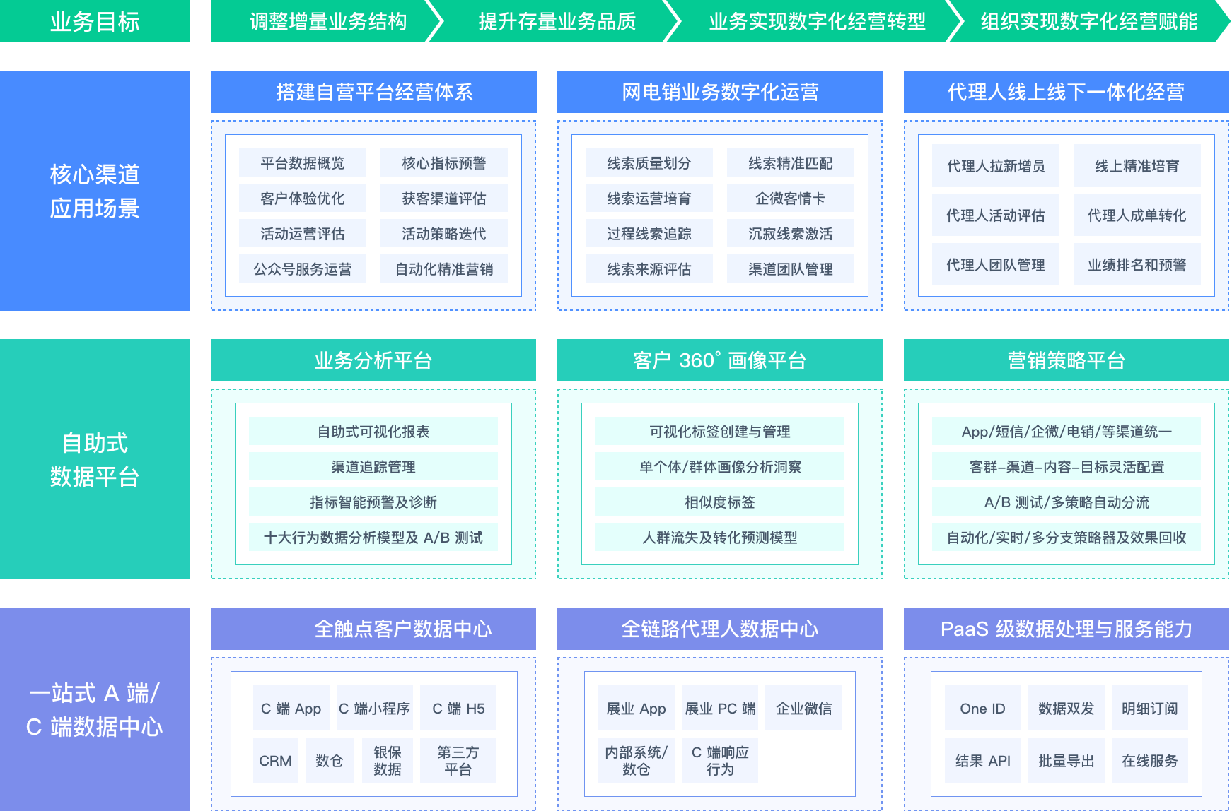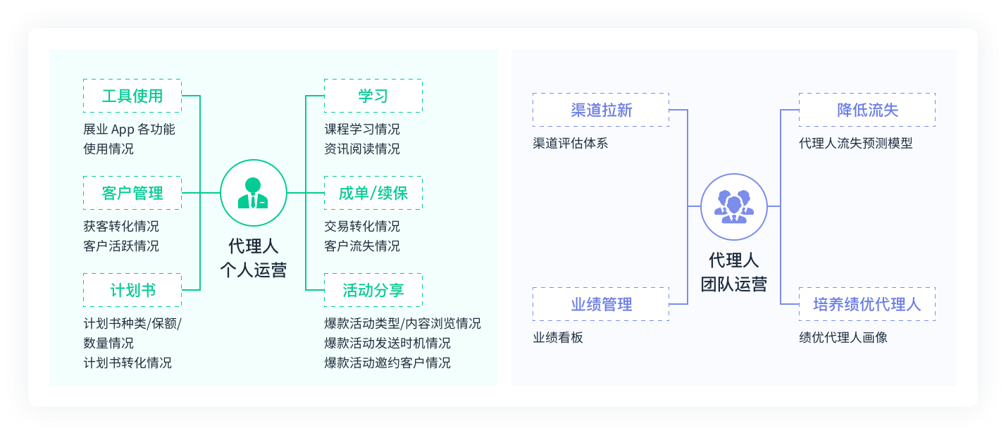 保险行业解决方案全景架构图  助力险企实现线上化客户迁移,提高直销平台客户转化率 打造活动运营体系 通过在线活动进行自营平台的拉新引流,完整追踪不同渠道来源用户的转化、裂变效果 构建业务提升专题 优化平台的使用体验并提供千人多面的个性化服务,提升自营平台的客户转化率  网电销渠道线索全流程精细化培育与转化 全链路追踪线索表现,衡量真实 ROI 打通投放在媒体平台的“展点消”数据与进入私域平台后的注册转化等数据,科学客观衡量线索的投入与产出 线索的多触点培育与转化 运用电销、企业微信、社群等不同运营手段交叉培育线索,提升线索意向及转化率,高效达成首投、复投、升级等经营指标  代理人队伍数字化管理与赋能 赋能代理人个人展业与成长 从活动分享、计划书制作、客户管理等关键环节提升代理人展业效果,并优化线上培训体验牵引代理人成长 打造代理人团队管理体系 通过业绩看板与展业工具使用情况,建立代理人管理体系,树立绩优代理人标杆画像,并通过预测模型降低代理人流失
