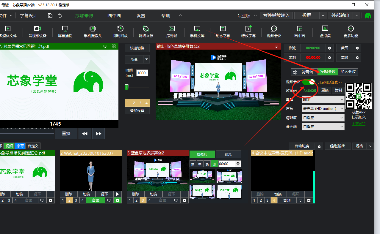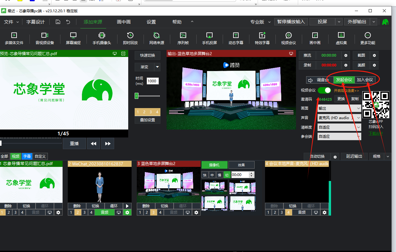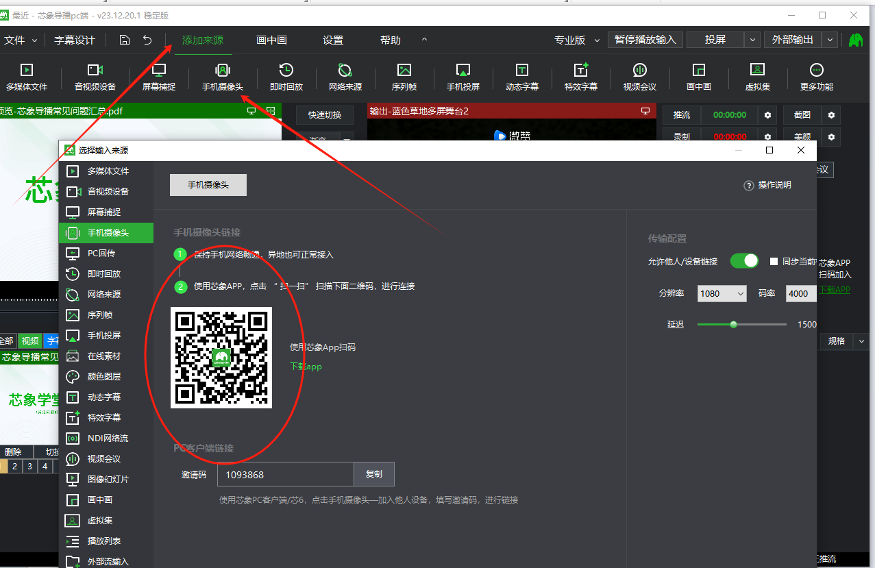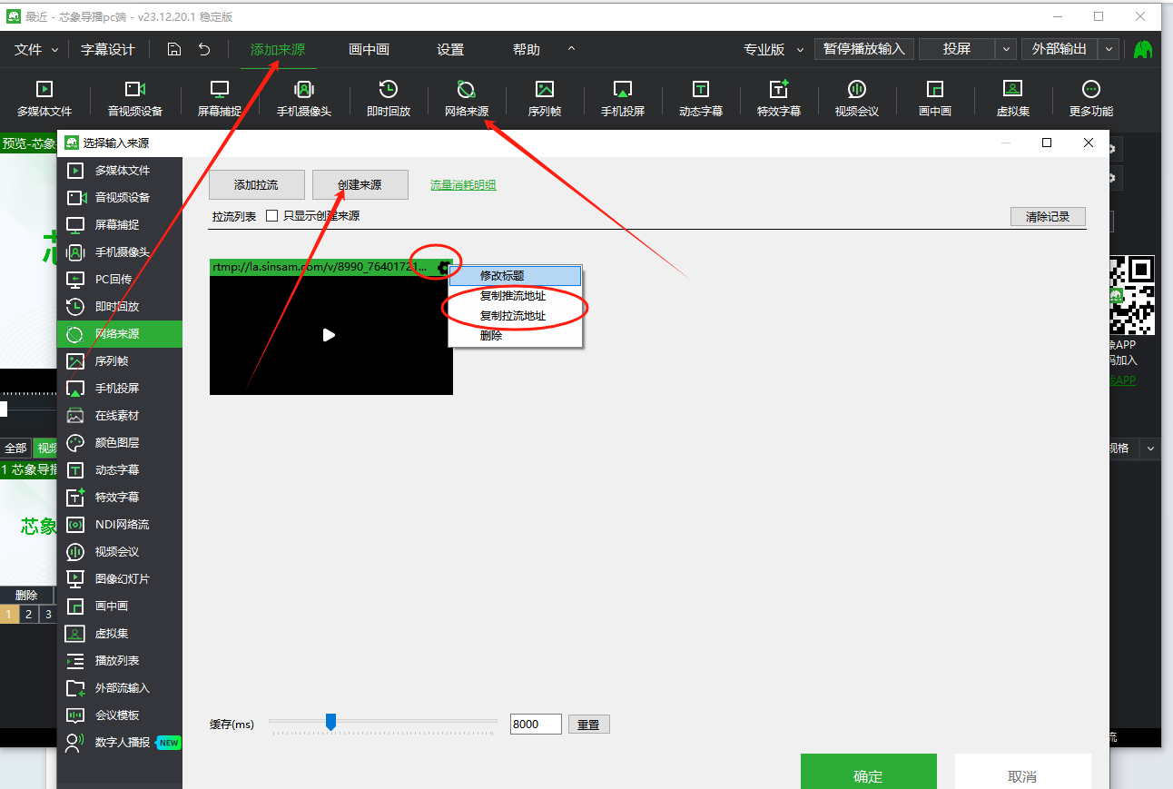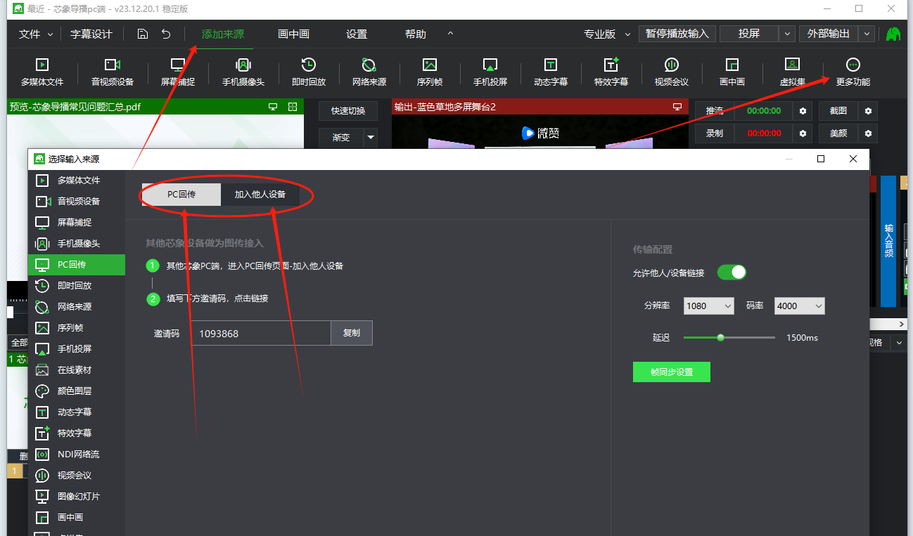 异地的画面传回到本机芯象导播教程 此教程分为几种类型这边依次制作不同直播场景下的教程 ## 场景一: 异地那边是摄像机用采集卡连接电脑,电脑也是有安装芯象导播,想那边的芯象导播的画面传回到芯象导播有三个教程均可实现 ### 教程1: 你这边本机的芯象导播找到PC 回传,发PC 回传的邀请码给对方,对应的芯象导播则选择加入PC回传,可以把对方的芯象导播的输出机位的画面跟声音传回来你这边芯象导播机位  ### 教程2: 你这边本机的芯象导播找到视频会议功能,开启视频会议然后把连麦邀请码给对方,对应那边的芯象导播则选择加入视频会议,也可以把对方的芯象导播的输出机位的画面跟声音传回来你这边芯象导播机位  教程3:你这边打开芯象导播,找到添加来源,网络来源去创建来源,创建一个推流地址跟拉流地址,然后推流地址可以对方那边的芯象导播或者其他直播推流设备填写推流地址去推,然后你这边的芯象导播或者其他软件(例如OBS,vmix)等支持粘贴拉流地址功能即可把画面传回到你这边软件设备机位,如果用户是用的我们芯象创建的推拉流地址这种,可以推荐先芯象币先充值50或者100,然后这种使用是今天使用,明天才扣费,包括这个位置可以看到具体使用的流量消耗情况,哪怕今天用超了,可以明天或者下一次使用的时候去续费这里补回去金额即可哈,因为如果欠费了就不给创建使用 (大伙如果近期有用到芯象创建的推拉流功能的,给大伙提醒一下哈,这个功能1月1号起是按流量计费模式走了,如果大伙需要创建推拉流地址中转,需要对应登录账号我的资产里面的芯象币不能欠费,包括这个功能拉流中转流量计费细则参考: <https://www.sinsam.com/sm/help/?TypeName=%E8%BE%93%E5%85%A5%E6%96%B9%E5%BC%8F&TabId=1&Keyword=%E6%8B%89%E6%B5%81&ArticleID=1220)>    ## 场景二: 如果你这边本地是电脑的芯象导播,但是异地那边只是想手机拍摄的画面传回来,这种也有对应三个教程方法 ### 教程1: 你这边的芯象导播软件打开手机摄像头功能,异地那边手机下载芯象app登录后点扫一扫扫码加入进来   ### 教程2: 你这边本机的芯象导播找到视频会议功能开启视频会议有一个邀请码,对方手机下载芯象app,点视频会议,选择加入视频会议,输入邀请码加入   ### 教程3: 你这边打开芯象导播,找到添加来源,网络来源去创建来源,创建一个推流地址跟拉流地址,然后推流地址可以对方那边,那边手机下载芯象app或者微赞app,复制推流地址给那边app 上填写推流地址点开始推流,画面那些即可拉回芯象导播,其他直播设备支持粘贴拉流地址的功能拉回来异地的手机画面,不过用的我们芯象创建的推拉流地址这种是需要按流量摸索计费,可以推荐先芯象币先充值50或者100,然后这种使用是今天使用,明天才扣费,包括这个位置可以看到具体使用的流量消耗情况,哪怕今天用超了,可以明天或者下一次使用的时候去续费这里补回去金额即可哈,因为如果欠费了就不给创建使用 (大伙如果近期有用到芯象创建的推拉流功能的,给大伙提醒一下哈,这个功能1月1号起是按流量计费模式走了,如果大伙需要创建推拉流地址中转,需要对应登录账号我的资产里面的芯象币不能欠费,包括这个功能拉流中转流量计费细则参考: <https://www.sinsam.com/sm/help/?TypeName=%E8%BE%93%E5%85%A5%E6%96%B9%E5%BC%8F&TabId=1&Keyword=%E6%8B%89%E6%B5%81&ArticleID=1220)>